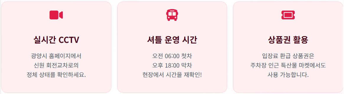 실시간 교통 상황 및 CCTV 확인: 광양시 홈페이지나 MY광양 앱을 통해 둔치 주차장 진입로인 신원 회전교차로의 정체 상태를 확인해야 합니다. 주차장 진입에만 1시간 이상 소요될 수 있습니다.