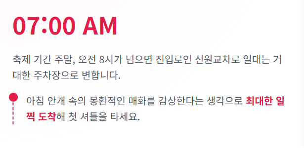 셔틀 대기 줄 관리 축제 관람을 마치고 내려오는 오후 2~4시 사이에는 주차장으로 돌아가는 셔틀 대기 줄이 매우 깁니다. 차라리 조금 일찍 내려오거나, 아예 늦게 내려오는 편이 대기 시간을 줄이는 방법입니다.