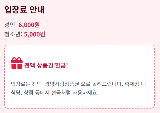 - 입장료는 전액 광양사랑상품권으로 환급되어 축제장 내 상점, 식당, 광양 시내 가맹점 등에서 현금처럼 사용 가능합니다.
