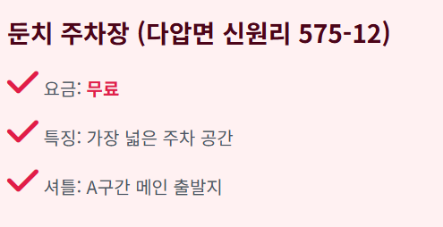 - 소둔치 주차장 (유료): 주말 위주로 운영되며 셔틀버스가 배차됩니다.