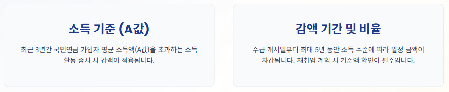 이때 기준이 되는 소득은 근로소득공제 후의 금액이 국민연금 전체 가입자의 최근 3년간 평균 소득액(A값)을 초과하는지를 따집니다. 2026년 기준 A값은 전년도 경제 상황을 반영하여 결정되므로, 재취업이나 사업을 계획 중이신 분들은 이 기준액을 미리 확인하여 수령액 변화를 체크해 보셔야 합니다.