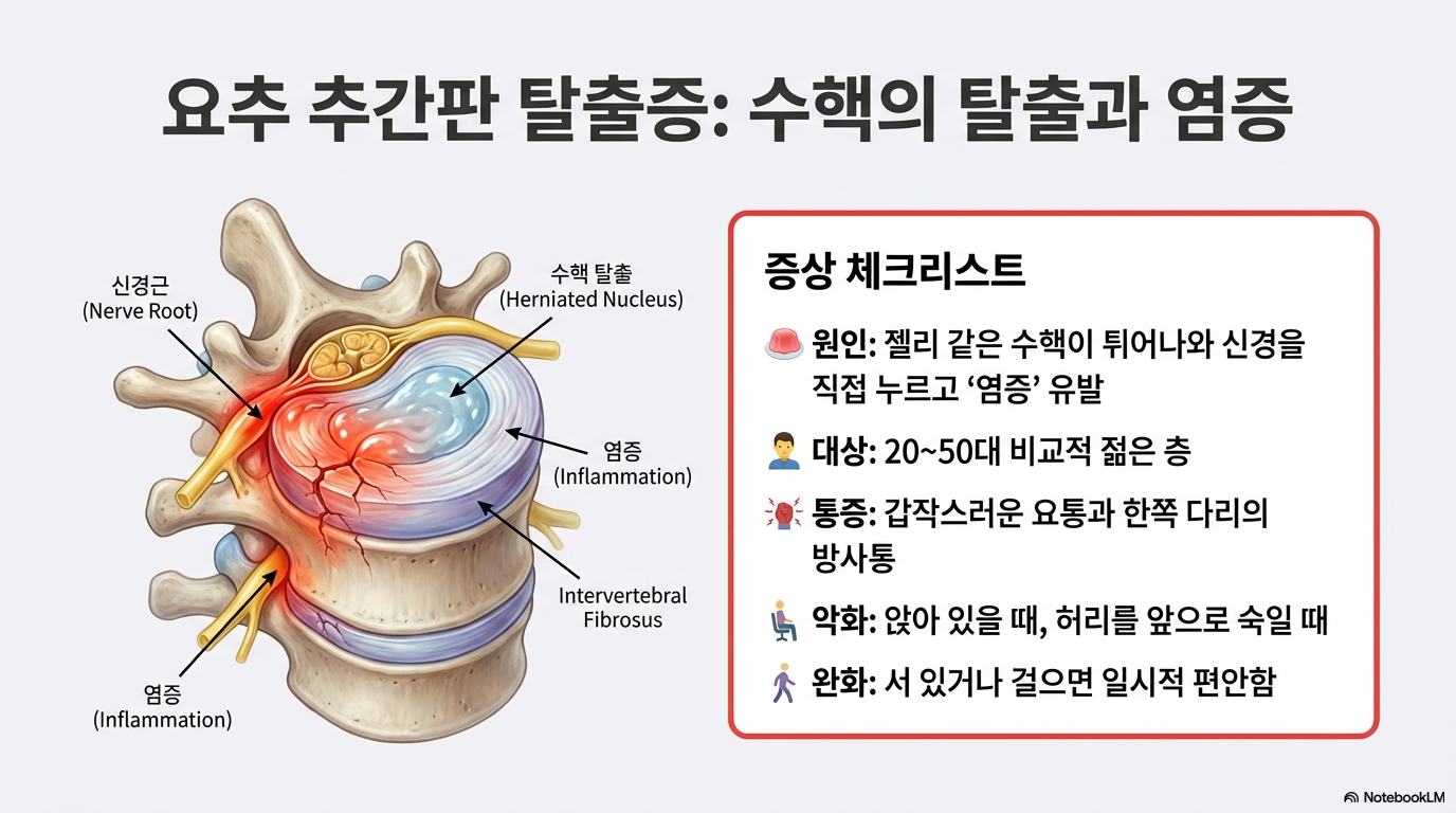 - 요추 추간판 탈출증 (허리 디스크): 척추 사이의 수핵이 튀어나와 신경에 염증을 일으키는 상태입니다. 주로 허리를 앞으로 숙일 때 수핵이 신경을 더 강하게 압박하여 다리 저림이 심해지며, 서 있거나 걸으면 일시적으로 완화되기도 합니다.
