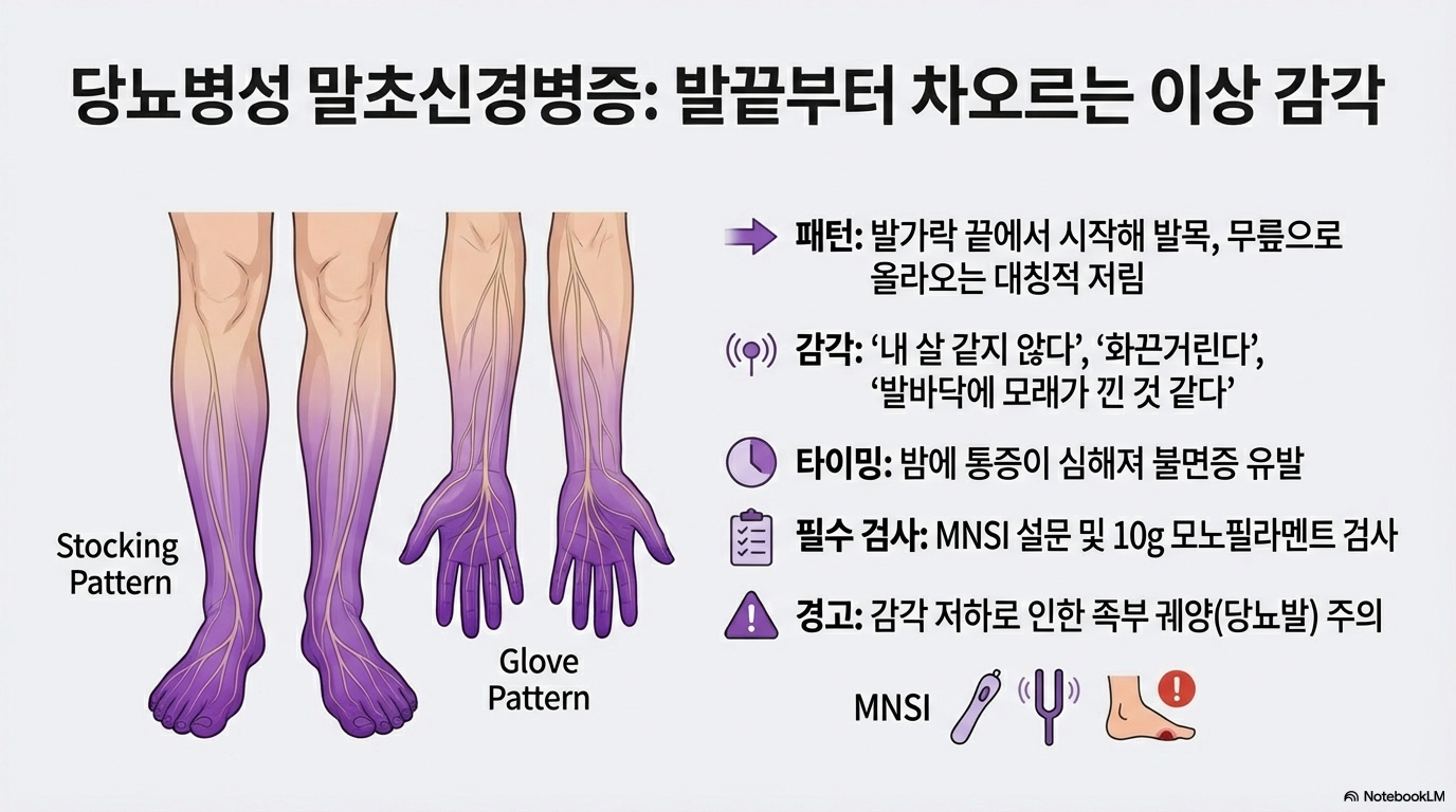 - 야간 통증의 특징: 낮보다 밤에 통증이 극심해지는 경향이 있으며, 이를 방치할 경우 감각이 아예 사라져 발에 상처가 나도 모른 채 썩어가는 '당뇨발'로 진행될 위험이 큽니다.