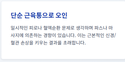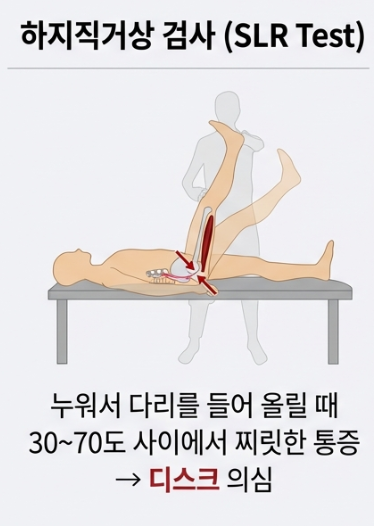 - 이상근 증후군: 엉덩이 깊숙한 곳의 근육(이상근)이 좌골신경을 누르는 것입니다. 엉덩이를 안쪽으로 회전시켰을 때 통증이 심해진다면 디스크보다는 근육의 문제일 가능성이 큽니다.