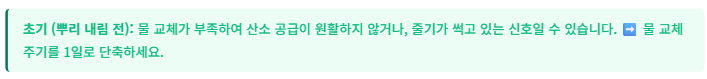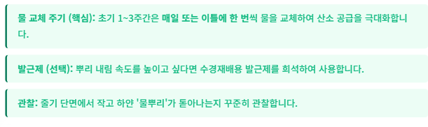 (일반 흙 화분용 비료는 농도가 진해 뿌리에 해가 될 수 있습니다.) - 물 교체 주기: 뿌리가 안정적으로 자라면 물 교체 주기를 3~5일로 늘립니다.