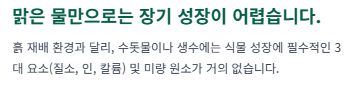흙은 자체적으로 무기질 양분을 품고 있지만, 수돗물이나 정수된 물은 식물 성장에 필수적인 양분(질소, 인, 칼륨 등)이 거의 없습니다.