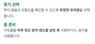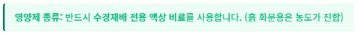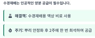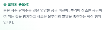 - 수경재배: 물을 자주 교체해도 양분은 고갈됩니다. 뿌리가 건강하게 자라게 하려면 외부에서 필수 미네랄 양분(액상 비료)을 공급해야 합니다.