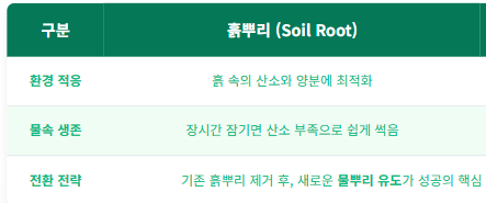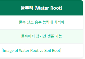- 흙뿌리 (Soil Root): 흙 속의 산소와 양분에 적합하게 발달하여, 물속에 장시간 잠기면 산소 부족으로 쉽게 썩을 수 있습니다.