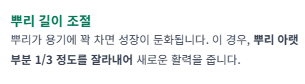 - 줄기 길이 조절: 뿌리가 너무 길어져 용기에 꽉 차면, 성장이 느려지거나 잎이 시들 수 있습니다. 이 경우, 뿌리의 아랫부분을 1/3 정도 깨끗하게 잘라내어 새로운 성장을 유도할 수 있습니다.
