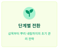 성공적인 뿌리 내림을 위한 집중 관리 단계입니다.