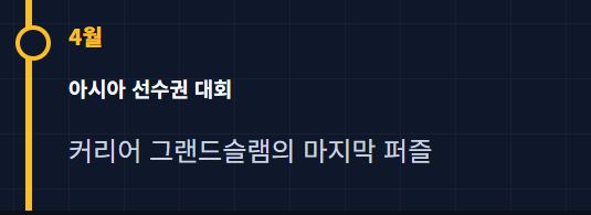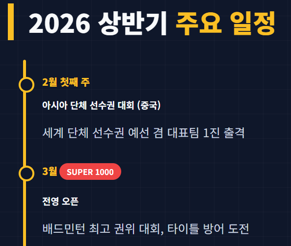 - 4월: 아시아 선수권 대회 - 안세영 선수가 개인 커리어 그랜드슬램 달성을 위해 반드시 우승해야 하는 중요한 무대입니다.
