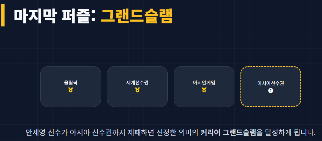 - 커리어 그랜드슬램 달성: 올림픽, 세계선수권, 아시안게임 금메달을 이미 보유한 안세영 선수가 아시아 선수권까지 제패하며 마지막 퍼즐을 맞출 수 있을지 전 세계의 이목이 쏠리고 있습니다.