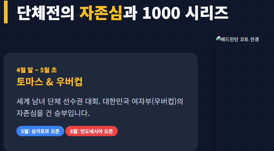 - 4월 말 ~ 5월 초: 토마스 & 우버컵 - 세계 남녀 단체 선수권 대회로 국가대표팀의 자존심이 걸린 경기입니다.