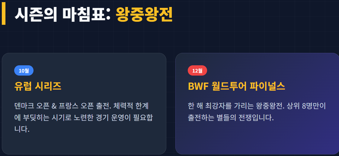 - 12월: BWF 월드투어 파이널스 - 한 해의 최강자를 가리는 왕중왕전 성격의 대회입니다.