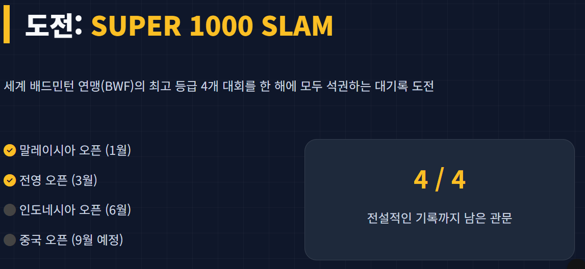 - 슈퍼 1000 슬램 도전: 말레이시아 오픈, 전영 오픈, 인도네시아 오픈, 중국 오픈을 모두 석권하는 대기록에 도전하고 있습니다.