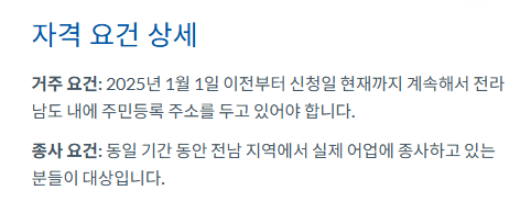 - 거주 요건: 2025년 1월 1일 이전부터 신청일 현재까지 계속해서 전라남도 내에 주민등록 주소를 두고 있어야 합니다.
