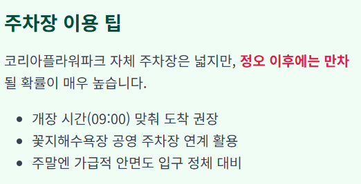 주차 전략: 코리아플라워파크 자체 주차장이 매우 넓지만 정오가 지나면 만차될 확률이 높습니다.