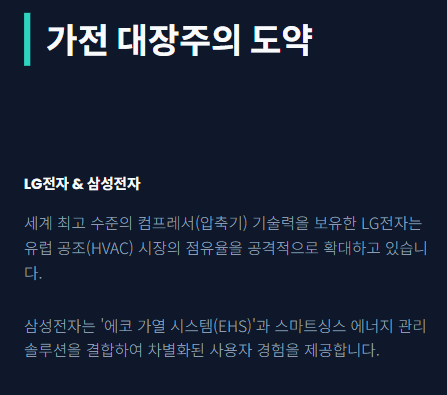 - LG전자: 세계 최고 수준의 컴프레서(압축기) 기술력을 바탕으로 유럽 주거용 히트펌프 시장에서 점유율을 빠르게 높이고 있습니다. 가전 분야의 노하우를 공조(HVAC) 시스템으로 확장하며 대장주 역할을 하고 있습니다.