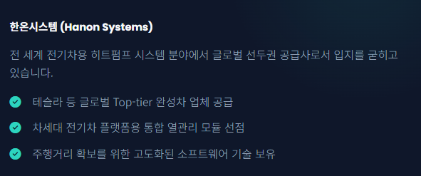 - 한온시스템: 자동차 공조 제품 전문 기업으로, 전기차용 히트펌프 시스템 분야에서 글로벌 선두권 공급사입니다. 테슬라를 포함한 주요 완성차 업체에 열관리 솔루션을 납품합니다.