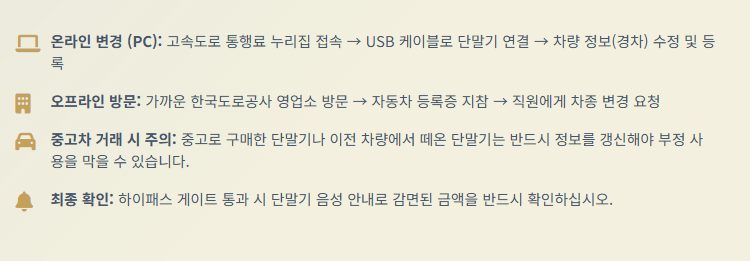 - 하이패스 카드: 카드는 종류에 상관없습니다. 일반 선불카드, 후불카드, 자동충전 카드 모두 사용 가능하며, 단말기가 경차로 등록되어 있다면 어떤 카드를 꽂아도 500원이 아닌 250원(50% 할인 예시)만 결제됩니다.