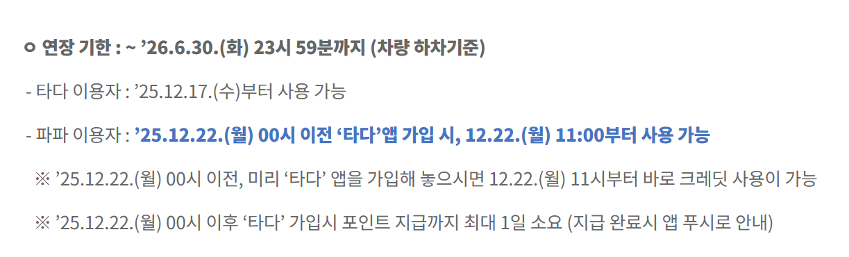 | 타다(TADA) 이용자 | 2025. 12. 17.부터 | 기존 타다 앱에서 잔여 포인트 확인 후 즉시 사용 가능 |