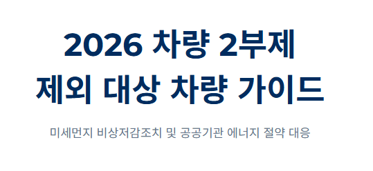 2026년 현재 미세먼지 비상저감조치나 공공기관 에너지 절약 등을 이유로 시행되는 **차량 2부제(홀짝제)**에서 제외되는 차량 기준을 정리해 드립니다.