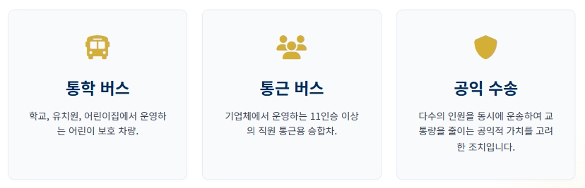 - 통학·통근용 승합차: 학교, 유치원, 어린이집 버스 및 기업체 통근 버스(11인승 이상).