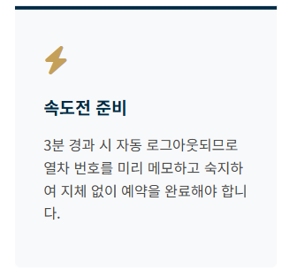 - 예매 시도 횟수 제한: KTX의 경우 1회 로그인당 최대 6번의 예약 시도 기회가 주어지며, 3분이 지나면 자동 로그아웃되므로 미리 열차 번호를 메모해두어야 합니다.